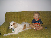 Aaron was in Chicago this last week so up took the boys up to the mountains, and of course we always take our Brittney dog. Poor Brittney has been getting older I guess, and has been having seizures the last 6 or 8 months. And I guess it was finally her time to go. She passed away lying peacefully in the grass on Thursday, August 9th. Poor us, we miss her terribly! Luckily the boys are too young to be devastated, but I know they will miss her a lot - Alden has been saying everyday, "I miss Bee-bee so much!" We all do. Emmett loved Brittney too - and she was the most gentle, patient dog. Even when Emmy pulls her ears, pokes her eyes, and bites her paws, Brittney hardly made a sound. As you can tell from the pictures, she has been Alden's buddy since he was born. Can a boy grow up without a dog?
